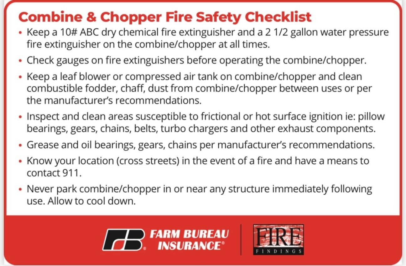 Order free fire safety checklist decals (above) from your Farm Bureau Insurance Agent, county Farm Bureau office, or MFB Regional Manager. Currently available stickers are tailored specifically for combines and choppers; grass mowers; skid steers and track loaders. The skid steer version is available in Spanish.