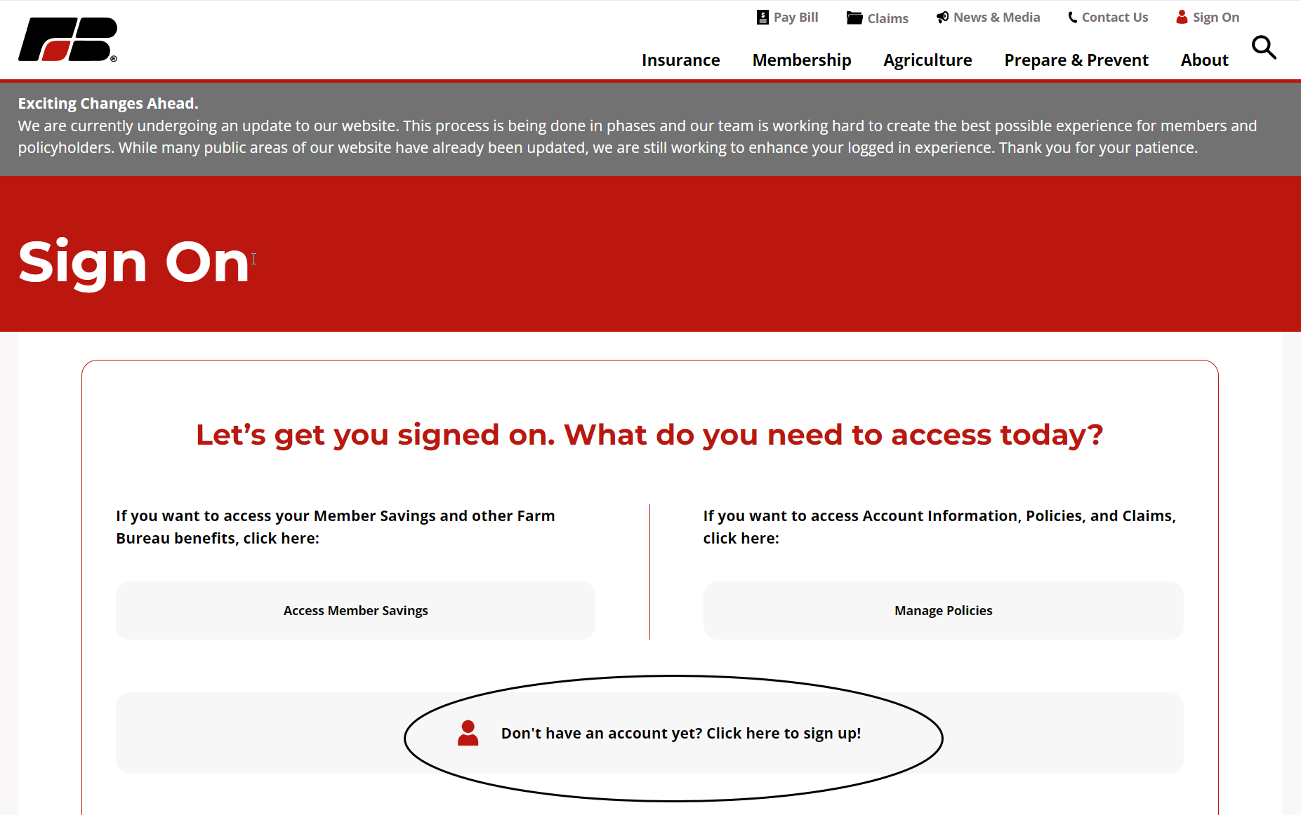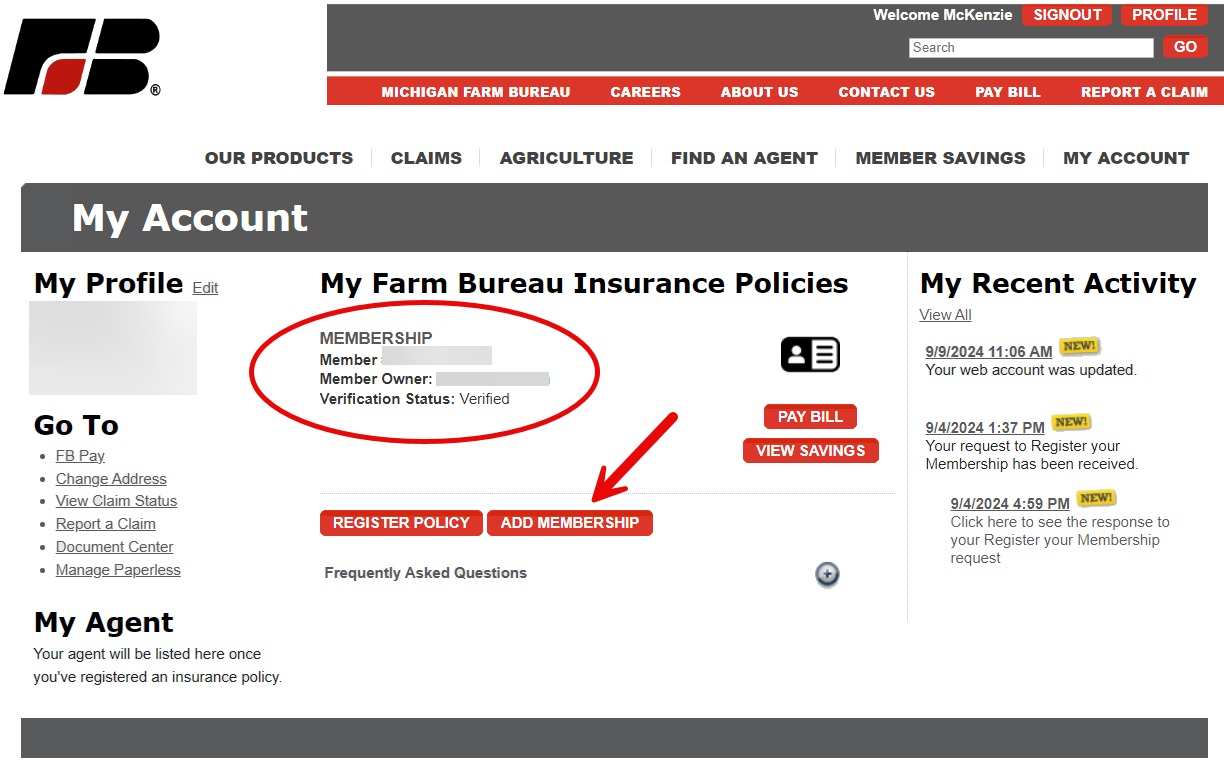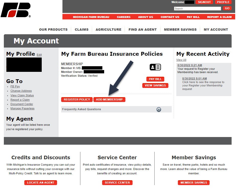 To make sure your membership is linked, click the My Account button (next to the Sign Out button) after signing in. If your membership is listed under My Farm Bureau Insurance Policies, you’re all set. If not, scroll down to the Add Membership button and fill out the form. You will need your membership number, which can be found on your membership card. If you do not have access to your membership card, contact your county Farm Bureau.