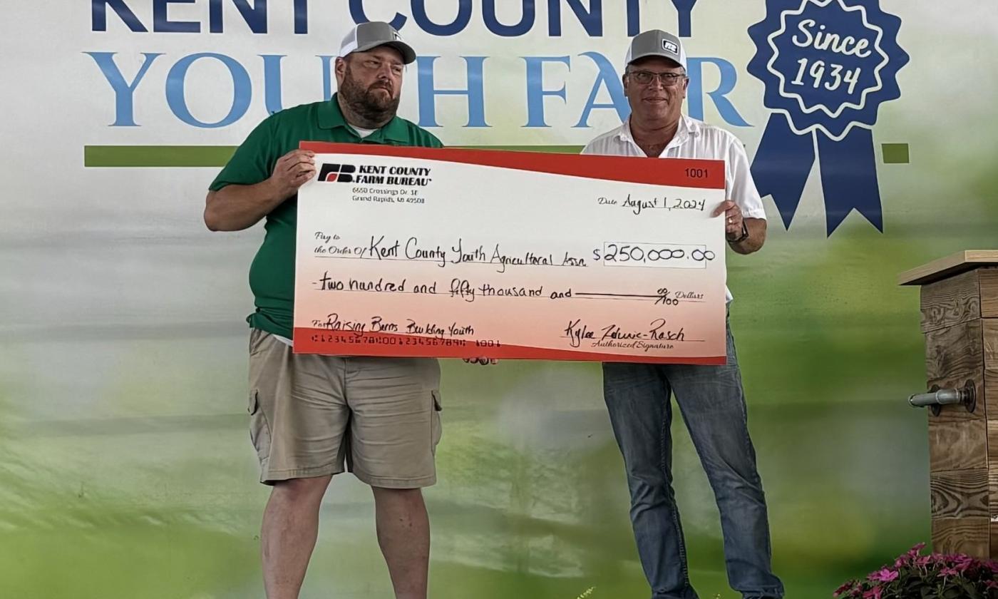 At last year’s Fair, we announced a matching gift challenge for the Fair’s Raising Barns, Building Youth campaign: up to $750,000 over the next 3 years. It was wildly successful for the Kent County Youth Agricultural Association (KCYAA), helping them raise over $2,000,000 in gifts and grants. So this year, our Board Vice President Bruce Klamer got to present them with a $250,000 dollar check. We are grateful for the vision of the current Board of Directors, the financial stewardship of past Boards, and for the hard work of the KCYAA that made this gift possible.