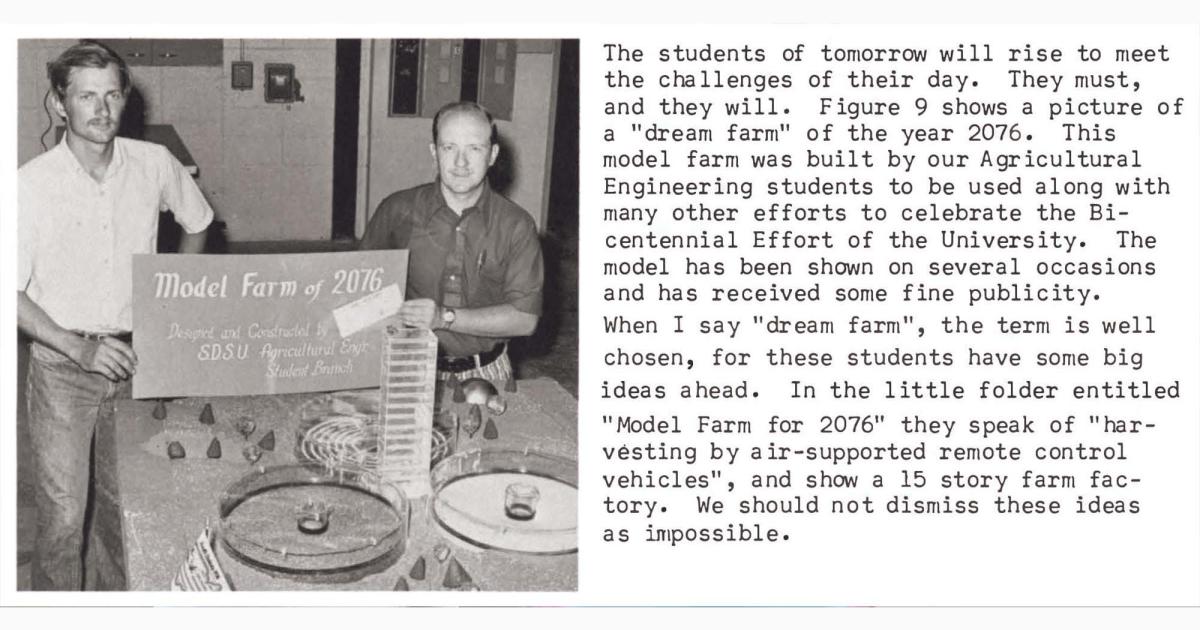 I started kindergarten in the fall of 1974 when a “Farming in 2076” piece ran in AFBF’s American Farmer magazine, summarizing a student project to imagine agriculture’s future. That was 47 years ago, and we’ve got another 55 years before we can judge how well the ag engineering students at South Dakota State (home of the Jackrabbits*) predicted a future they won’t live to see.